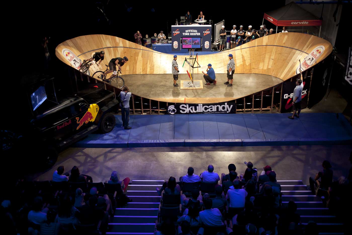Red Bull Mini Drome is the ultimate arena to showcase your single speed cycling skills. A scaled down velodrome was constructed for the sole purpose of seeing who can complete ten laps in the shortest time.